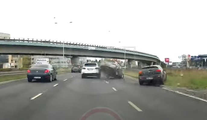 Video no Polijas: Kia vadītāja pēdējā brīža lēmums atgriezties uz automaģistrāles noved pie sadursmes, kurā iesaistīts vēl arī Porsche un Alfa Romeo.