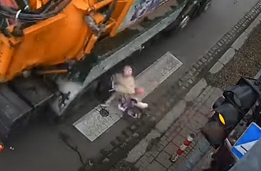 Mazais riteņbraucējs izstūrē uz gājēju pārejas tieši tajā brīdī, kad garām brauc smagais auto. Komentāros teikts, ka laimīgā kārtā, bērns nav cietis.