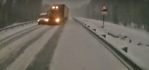 Video autors knapi izmainās ar pretimbraucošo kravas auto, kas uzsācis neapdomīgu apdzīšanas manevru.