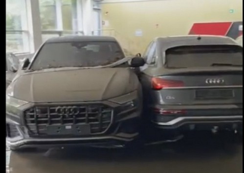 Starp cietušajām automašīnām var redzēt Audi Q3, Q5 un Q8 krosoverus, sportiskos RS6 Avant un RS Q3 Sportback, kā arī pilnībā elektriskos e-tron GT, e-tron un e-tron Sportback. Pēc video autora teiktā, viņš šo videoklipu nofilmējis nākamajā dienā plūdu laukā, kad ūdens mazumtirdzniecības telpā noplaka, taču medijos atrodams vēl kāds cits video par šo pašu autosalonu, kad ūdens bija sasniedzis augstāko līmeni, piepildot telpu līdz pat automašīnu jumtiem.