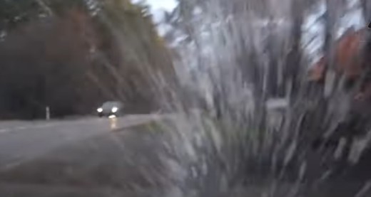Filmētājs nobrauc no ceļa, kad viņa automašīnas riteņi zaudē saķeri slidenās ceļa virsmas un šiem apstākļiem pārāk lielā ātruma rezultātā.