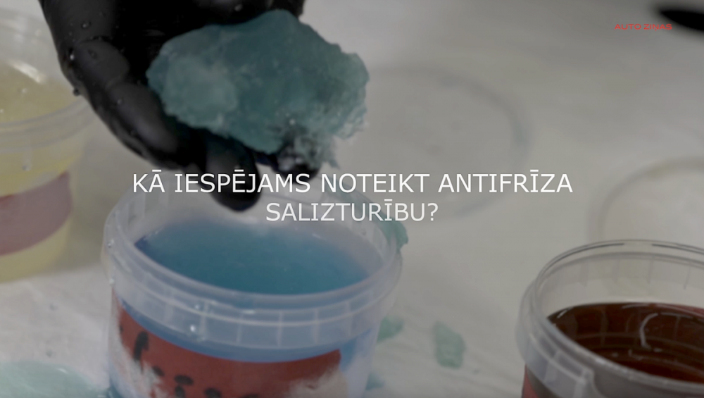 Tehniskā speciālista rīcībā ir vairāki šķidrumu paraugi spilgtās krāsās. “Zilais ir antifrīzs. Normāli tā sasalšnas temperatūra ir ļoti zema, 40 - 50 grādi zem nulles. Šajā gadījumā tas ir krietni atškaidīts, tāpēc izveidojies ledus klucītis. Ja antifrīzs piesaistītā ūdens sasalst, tā cirkulācija ir apgrūtināta. Var saplēst metāla detaļas, arī dzeses sistēmas sūkni.” Bet vai antifrīza līmenis var nokristies pats no sevis? “Jā, var,” saka E. Lulle, “Dažas sastāvdaļas laika gaitā izgaro, tādēļ var nokristies līmenis.” Vai antifrīza līmeni drīskt papildināt ar parastu ūdeni? “Ūdeni nevajag liet klāt. Tā radīsim ilgtermiņā problēmas. Ja tiešām ir bezizejas situācija, pielejam ūdeni, bet pie pirmās izdevības nomainam visu dzeses škidrumu,” rekomendē Lulle. Vairāk skaties TV Autoziņu sižetā.