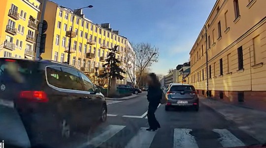 Video no Polijas - rullīša autors apgalvo, ka Volkswagen vadītājs brauc pa nepareizo braukšanas joslu, apdzen citas sastrēgumā stāvošās automašīnas un gandrīz notrieca ielu šķērsojošu gājēju.