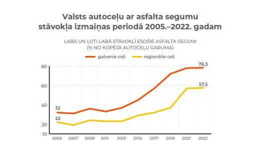 Šis ir labākais rādītājs pēdējo 30 gadu laikā. Kopš 2005. gada šo labā un ļoti labā stāvoklī esošo ceļu apjoms ir ne tikai dubultojies, tas ir pieaudzis vairāk kā divas reizes - no 32% līdz 78,3% galveno ceļu segmentā un no 22% līdz 57,5% reģionālo ceļu segmentā.