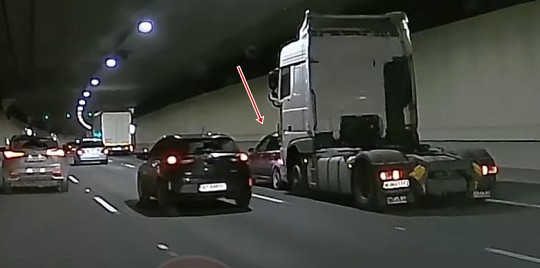 Kāds autoadītājs savā videoreģistratorā ierakstījis epizodi, kad kravas auto savos manevros nepamana vieglo automobili un uzsit pa tā aizmuguri. Pēc notikušā kravinieka šoferis neliekas traucēties un mierīgi aizbrauc.