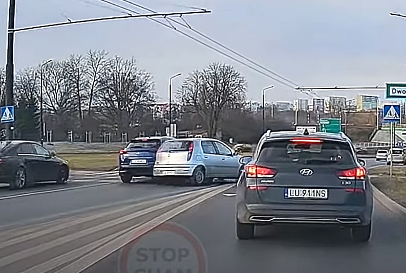 Gājēju pāreja Polijā uz ceļa ar trim joslām. Komentārā teikts, ka šī ārkārtīgi bīstamā pāreja būtu ar steigu jālikvidē.
