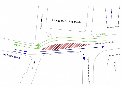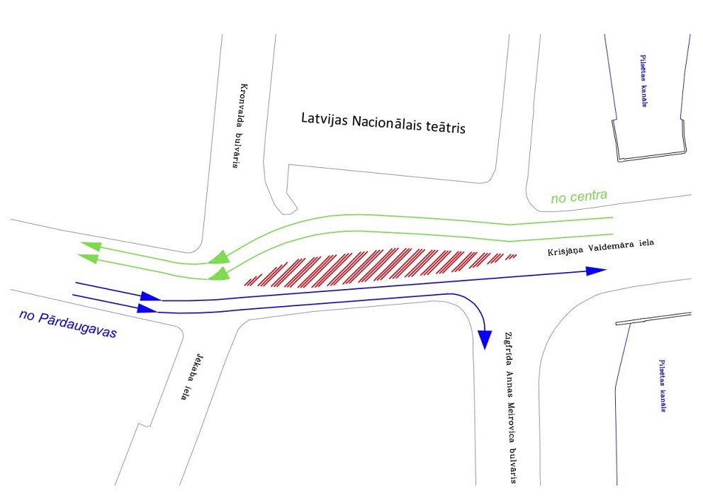 Kā ziņots, laika posmā no 13. – 17. jūnijam ir ierobežota satiksme virzienā no centra uz Pārdaugavu. Kr.Valdemāra ielā virzienā uz Pārdaugavu ir sašaurinātas divas braukšanas joslas, novirzot tās tuvāk Nacionālā teātra ēkai, un gājēju pāreja Kronvalda bulvārī pārcelta virzienā uz Muitas ielu.