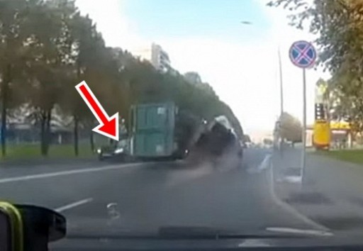 Tikai mirkli pēc tam, kad vieglais auto izmainās ar pretimbraucošo atkritumu vedēju, smagsvars ar visu kravu iegāžas pretējā joslā.