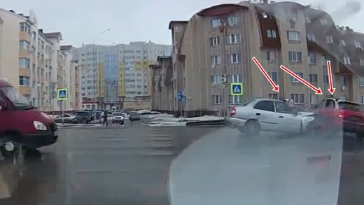 Griežoties pa kreisi, "Chevrolet" vadītājs nedaudz patraucē "Audi", kura vadītājs uz karstām pēdām griež savu spēkratu riņķī, lai panāktu pārkāpēju.