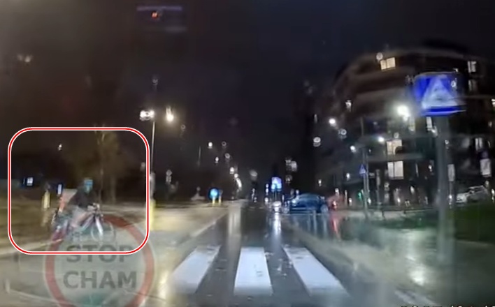 Bērns izbrauc uz pārejas neskatoties un nebremzējot. Autovadītājs pagūst nobremzēt pēdējā mirklī, bet bērna tēvs paņem velosipēda slēdzeni un nāk skaidroties.