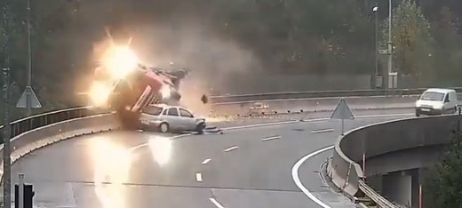 Vieglā auto vadītājs zaudē kontroli pār savu spēkratu un ietriecas blakus braucošajā kravas auto, liekot tam atsisties pret viadukta margām. Drošības konstrukcija neiztur, kravinieks nogāžas no 40m augstuma un aizrauj nāvē arī tā šoferi.