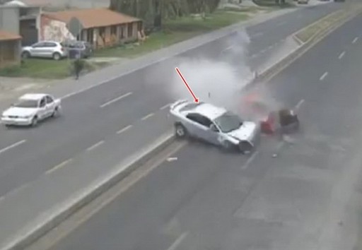 Baltā Dodge vadītājs zaudē kontroli, viņa vadītais spēkrats sagriežas un ieslīd pretējā joslā, kur saduras ar pretimbraucošo Volkswagen.