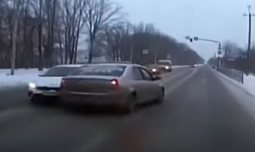 Sieviete novērš uzmanību no ceļa un iebrauc pretējā joslā, kur saduras ar Renault Logan, bet video autoram izdodas izvairīties.