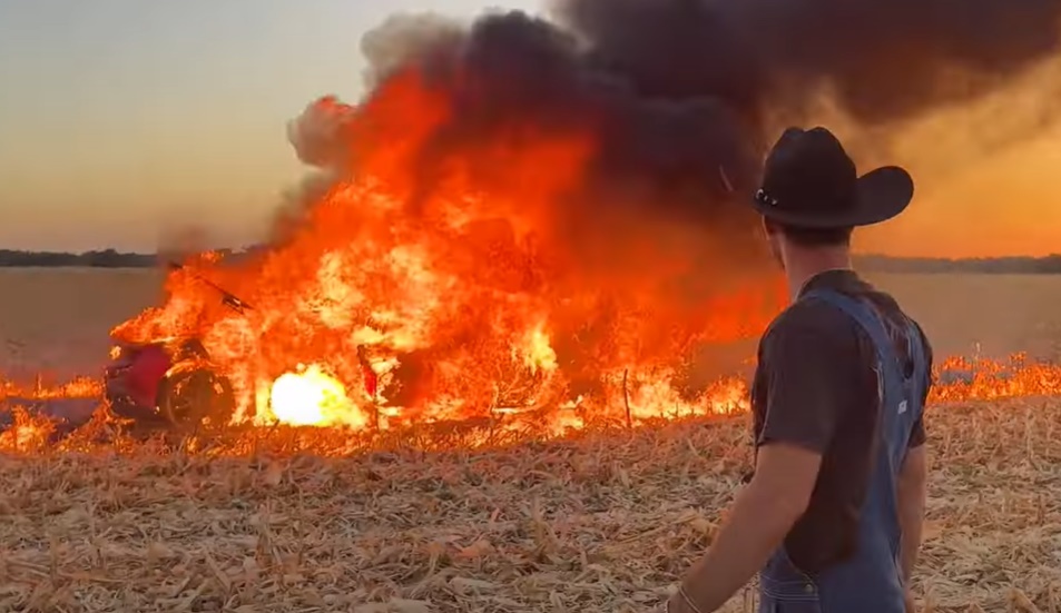 Pārējais ir tikai likumsakarīgi – sakarsētajām detaļām saskaroties ar sausajām kukurūzas stiebru atliekām, uzliesmo uguns un lieta darīta – uguns dažu minūšu laikā apņem gluži jauno Ferrari un “nejauši” tuvumā atstāto minivenu.