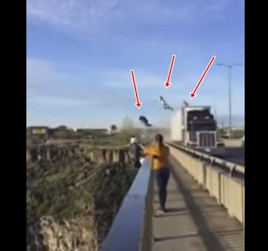 Video no ASV: trīs pārgalvīgi puiši izmanto braucošu kravas auto, lai nolēktu ar paraplānu no tilta, kas savieno divus, dziļi lejā tekošas upes krastus.