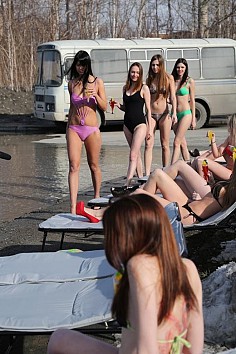 Meitenes peldkostīmos Krievijā cīnās pret bedrēm (+ foto)
