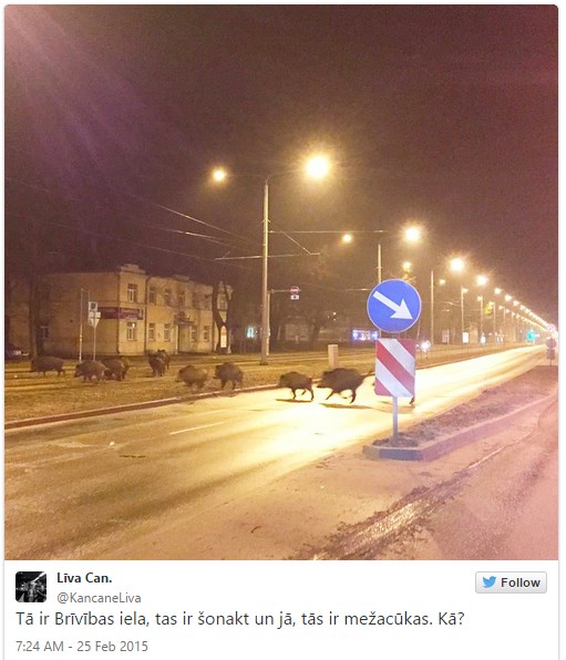 Piemēram, vienā no fotogrāfijām redzams, kā mežacūku bariņš šķērso Brīvības gatvi Juglā pie degvielas uzpildes stacijas "Neste".