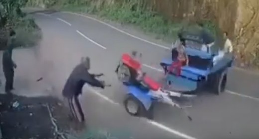 Motobloks ar piekabi pēkšņi izraujas no vadītāja rokām un "izkaisa" savus pasažierus uz ceļa.