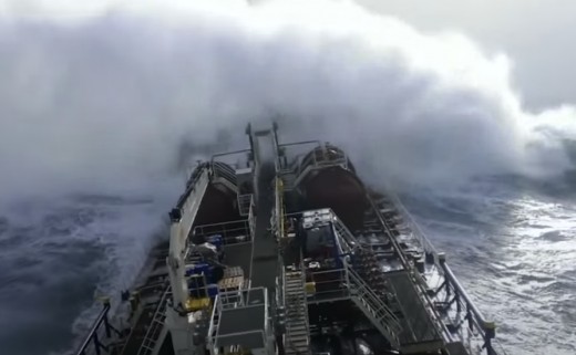 Tankkuģis cīnās ar milzu viļņiem (+ VIDEO)