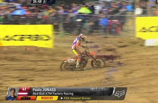 Paulam Jonasan, kurš šobrīd cīnās par savu pirmo MX2 čempiona titulu, liktenis sagādājis nepatīkamu pārsteigumu - kritiens pirmajos metros un cīņa pirmajā braucienā jāsāk no pēdējās vietas.