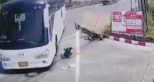 Autobusa šofera manevrs tik ļoti pārsteidz motocikla vadītāju, ka strauji bremzējot tas kopā ar savu pasažieri nokļūst nepatīkamā un visnotaļ bīstamā situācijā.
