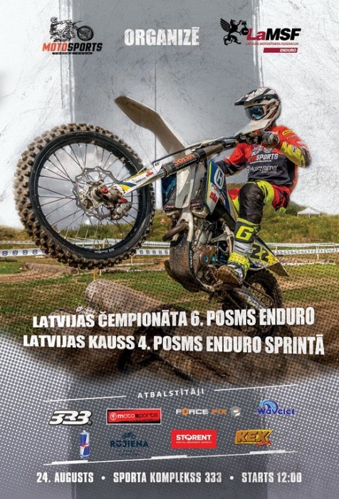 Sestdien, 24. augustā Ropažu novadā, sporta kompleksā „333” norisināsies Latvijas čempionāta sestais posms enduro un Latvijas kausa ceturtais posms enduro sprintā.