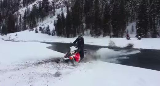 Ir jau skaisti ar sniega motociklu pārbraukt pāri upei, bet arī tas ir jāmāk (+ video)