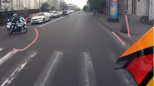 Riskējot ar savu, citu satiksmes dalībnieku un gājēju dzīvību, viņš traucas pa pilsētas ielām, brīžiem pat uz pakaļējiem riteņiem, ignorē luksoforus, pārbrauc zālājiem, trotuāriem un beigās arī gājēju tiltam. Pārkāpējam izdodas aizbēgt no policijas motopatruļas, taču vēlāk viņu atpazīst, aiztur un un piespriež piecas diennaktis aresta.