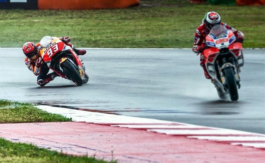 Markess, kurš pārstāv "Repsol Honda" komandu, slidenā trasē sacensībās finišēja pēc 50 minūtēm un 41,565 sekundēm, par 1,192 sekundēm pārspējot itāli Danilo Petruči no "Ostco Pramac" vienības.
