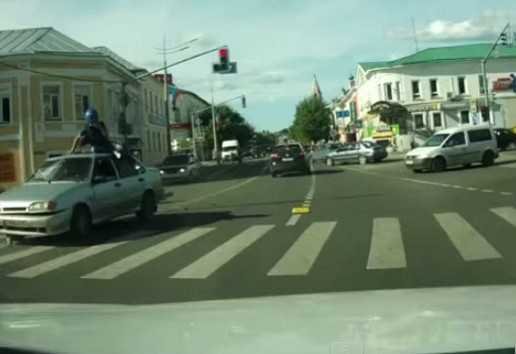 Motocikls ietriecas automobilī un pats uzlido uz jumta (+ video)
