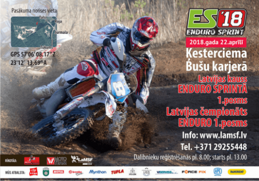 22. aprīlī Ķesterciema Bušu karjerā, Tukuma novada, Sēmes pagastā notiks Latvijas kausa pirmais posms Enduro Sprintā un Latvijas čempionāta pirmais posms Enduro.