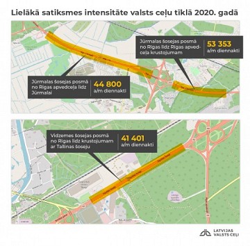 · Jūrmalas šoseja (A10) posmā no Rīgas līdz Rīgas apvedceļa (A5) (Salaspils–Babīte) krustojumam – 53353 automašīnas diennaktī;