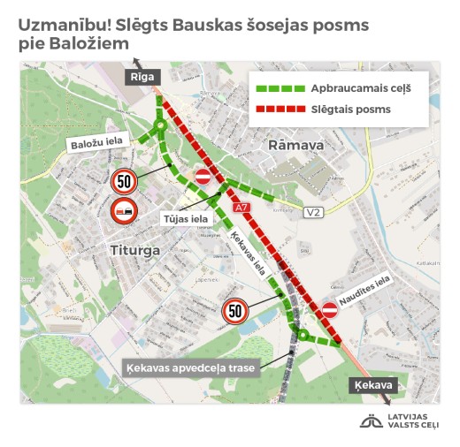 Turpinoties Ķekavas apvedceļa būvdarbiem, no trešdienas, 29. jūnija, līdz 2023. gada jūlijam tiek slēgts Bauskas šosejas (A7) posms no pagrieziena uz Baložiem līdz Katlakalnam (9.– 11. km), lai veiktu šī posma pārbūvi. Satiksmes plūsma no slēgtā posma tiks novirzīta pa jaunizbūvēto Ķekavas ielu paralēli Bauskas šosejai.