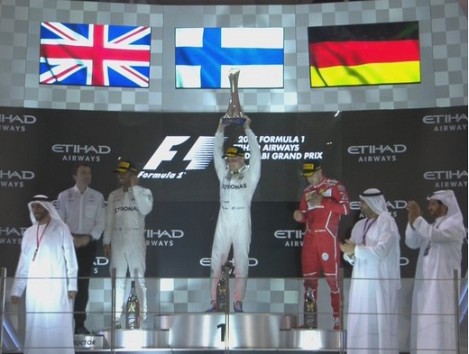 Botass sacensības sāka no "pole-postion" un startā nosargāja pirmo vietu. Sacensību pēdējos apļos viņam uz papēžiem mina komandas biedrs Lūiss Hamiltons no Lielbritānijas, kurš jau trīs posmus pirms sezonas beigām bija nodrošinājis titulu, tomēr Botass nosargāja savu pozīciju un izcīnīja uzvaru Abū Dabī Lielajā balvā, kamēr Hamiltons finišēja otrais, bet trešo vietu ieņēma Fetels, kurš līdz ar to nodrošināja sev vicečempiona titulu.