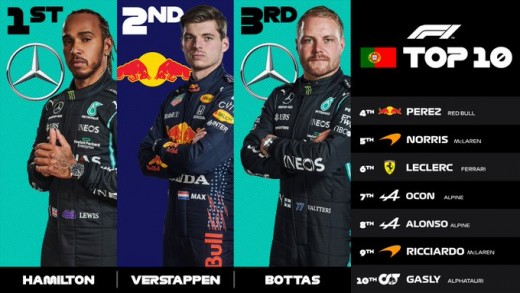 Hamiltons par 29,148 sekundēm apsteidza sīkstāko konkurentu Maksu Verstapenu no Nīderlandes ("Red Bull"), komandas biedrs soms Valteri Botass atpalika 33,53 sekundes, bet ceturtais ar nepilnu 40 sekunžu deficītu bija meksikānis Serhio Peress ("Red Bull").