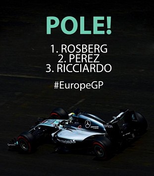 Rosbergs savu ātrāko apli veica minūtē un 42,758 sekundēs, bet otro vietu izcīnīja "Force India" meksikāņu pilots Serhio Peress, kurš bija par 0,757 sekundēm lēnāks. Identiskus apļa laikus uzrādīja "Red Bull" austrāliešu pilots Daniels Rikjardo un četrkārtējais pasaules čempions Sebastjans Fetels no "Ferrari", kuri rītdien startēs no otrās starta rindas.