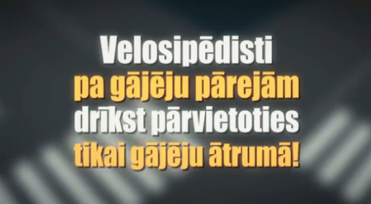 Velosipēdisti pa gājēju pārejām drīkst pārvietoties tikai gājēju ātrumā! – tik pat ātri kā gājējs, nevis tik pat ātri, kā braucot pa ceļu vai ietvi.