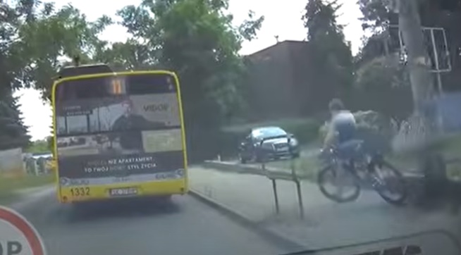 Braukšanas prasmes vēl neapguvušais jaunais velosipēdists aizķeras aiz apgaismes staba un krītot gandrīz pakļūst zem riteņiem. Video autors raksta, ka puika nav cietis, bet par notikušo paziņots vecākiem.