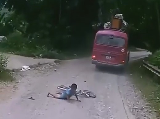 Bērns, kas ar velosipēdu negaidot izdrāžas no kāda mazāka ceļa, tikai brīnumainā kārtā nepakļūst zem autobusa riteņiem.