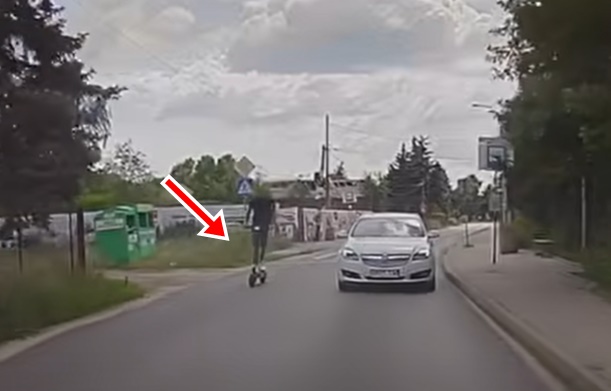 Video autors stāsta, ka pa šauro un līkumoto ceļu "hulajnoga" (poļu val.) brauc ar ātrumu, kas pārsniedz 30 km/h un riskējot ar sadursmi, apsteidz un apdzen automašīnas, pārvietojas bez aizsargķiveres un nedzird, kad viņam signalizē, tādēļ, ka austiņās klausās mūziku.